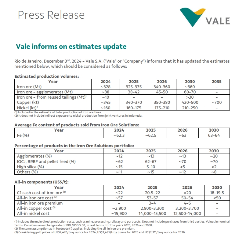 當(dāng)?shù)貢r間12月3日,淡水河谷發(fā)布公告稱,預(yù)計(jì)2024年鐵礦石產(chǎn)量約為3.28億噸,2025年為3.25-3.35億噸,2026年為3.4-3.6億噸,2030年約為3.6億噸。