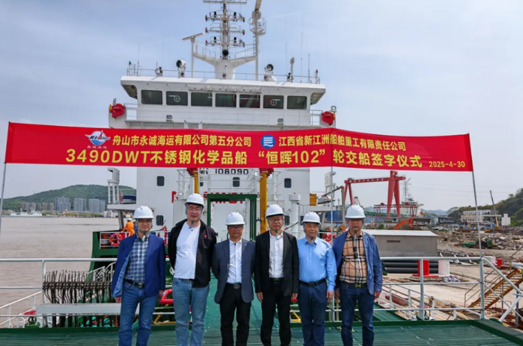 4月30日,江西省新江洲船舶重工有限責(zé)任公司承制的3490DWT不銹鋼化學(xué)品船(NJZ1116)在舟山市順利簽字交船。